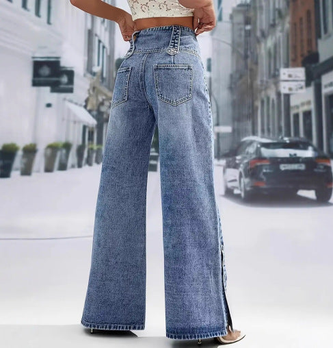 הגזרה היא סופר-גבוהה (High-Waist) עם סגירת כפתורים כפולה ואלמנטים עיצוביים בחגורה, שיוצרים אשליה של מותן צר ומחזיקים את הגוף בצורה מושלמת. הרגליים מתרחבות לגזרת Wide-Leg משוחררת וטרנדית, שנותנת תחושה של גובה ונוכחות.