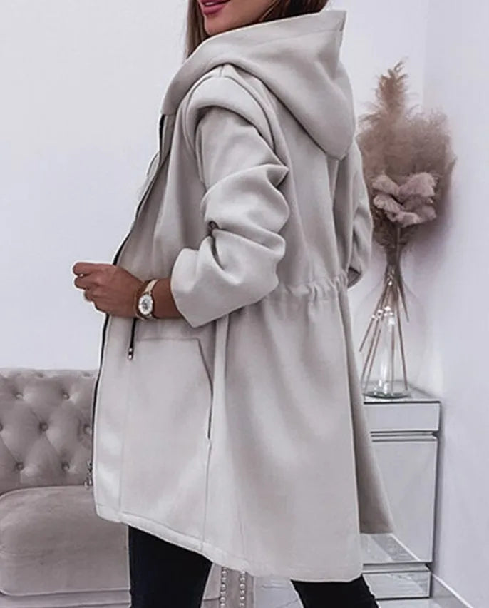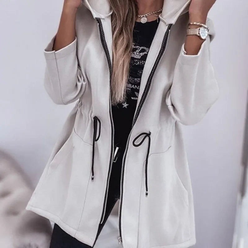 עשוי מבד איכותי ורך שנעים ללבישה ביום־יום, עם עיצוב אלגנטי הכולל כובע נוח, סגירת רוכסן קדמית וקשירה מותנית להדגשת הגזרה הנשית.