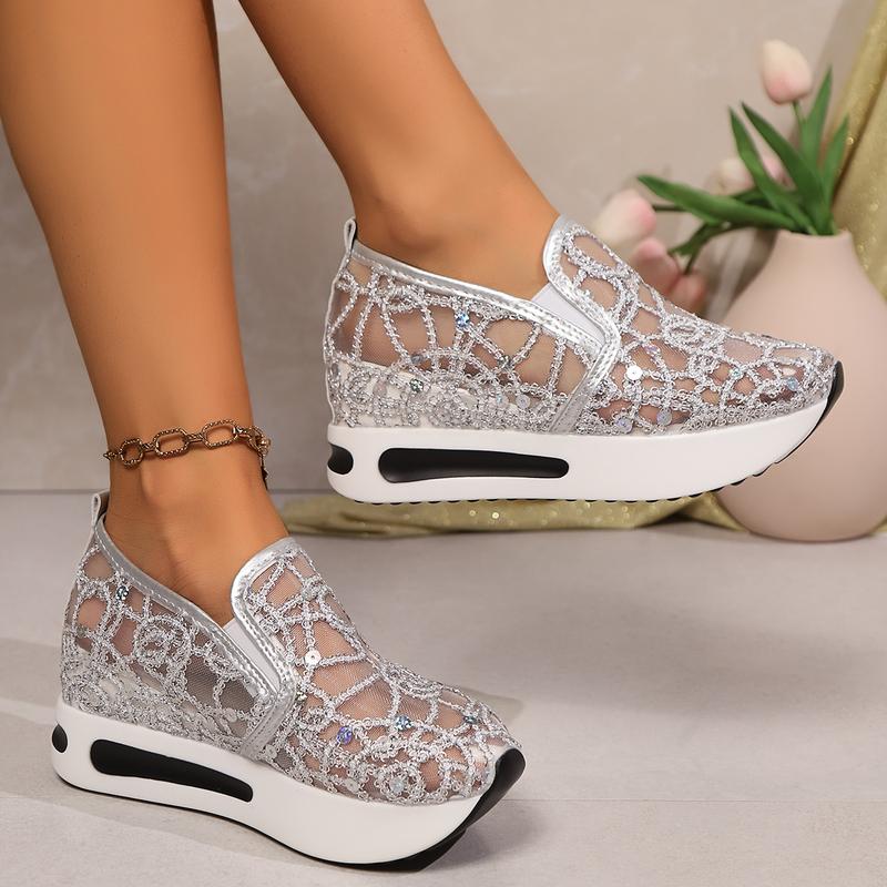 העיצוב משלב גפה עשויה רשת (Mesh) אוורירית ונושמת, המשובצת באבנים עדינות שנותנות נצנוץ יוקרתי בכל צעד. אבל הכוכבת האמיתית כאן היא הסוליה: פלטפורמה מוגבהת בטכנולוגיית "Cloud" שמעניקה לך תוספת גובה מחמיאה, תוך שמירה על יציבות וריפוד רך לכף הרגל.