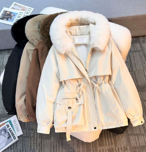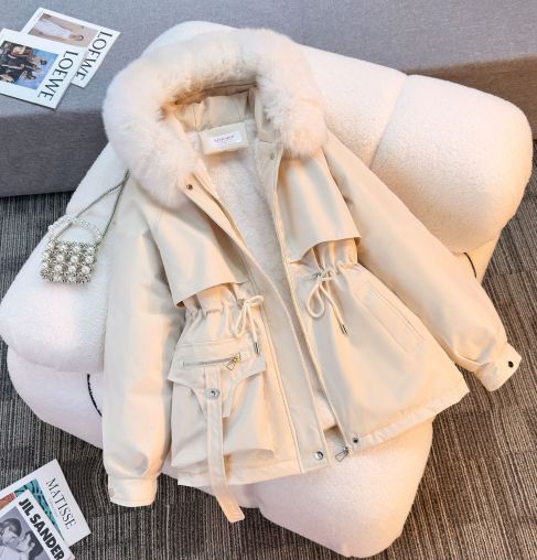 מעיל חורף לנשים Isabella בצבע בז’ עם קפוצ’ון ופרווה, עיצוב אלגנטי וגזרה מחמיאה