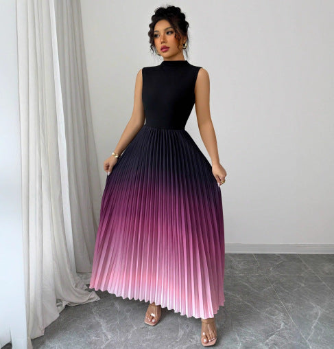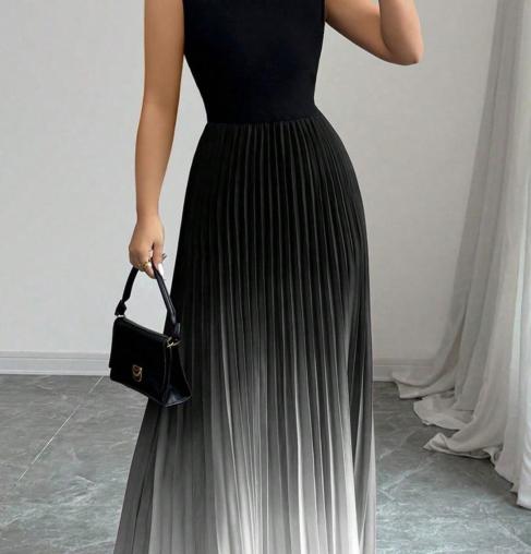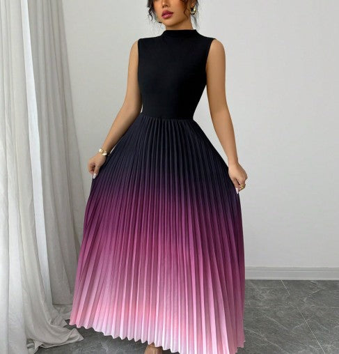 הקסם של דגם Twist נמצא בשילוב המדויק: החלק העליון מעוצב בגזרה שחורה, חלקה וצמודה עם צווארון גבוה (Mock Neck) שמעניק מראה אצילי ומחטב את פלג הגוף העליון. אבל ההצגה האמיתית מתחילה במותן – חצאית מקסי עשירה מבד פליסה (קפלים), שנפתחת במניפה מרהיבה ומשנה צבעים באפקט אומברה (Ombre) ייחודי – משחור עמוק, דרך סגול/בורדו ועד לורוד בהיר ורך בסיומת.